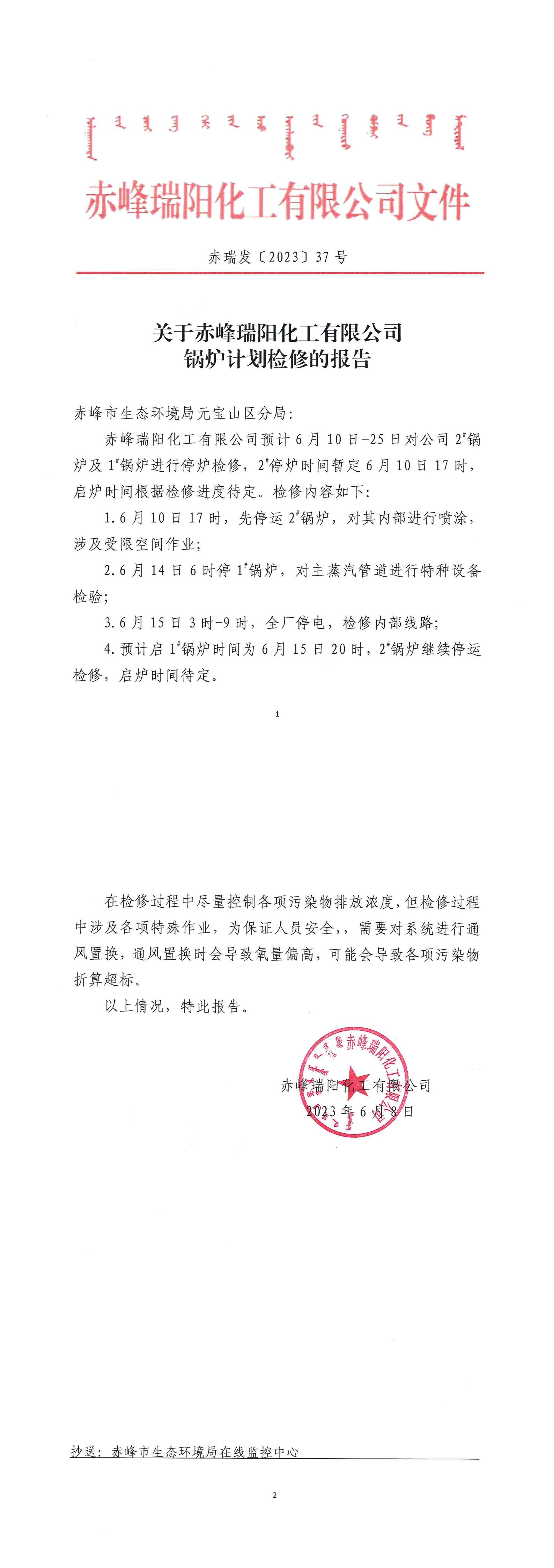 赤瑞發(fā)〔2023〕37號:關(guān)于赤峰瑞陽化工有限公司鍋爐計劃檢修的報告